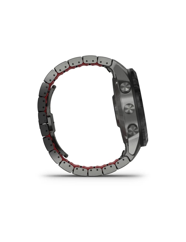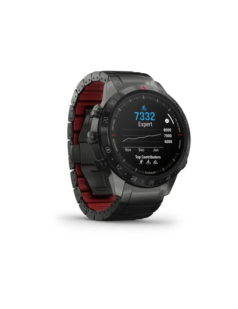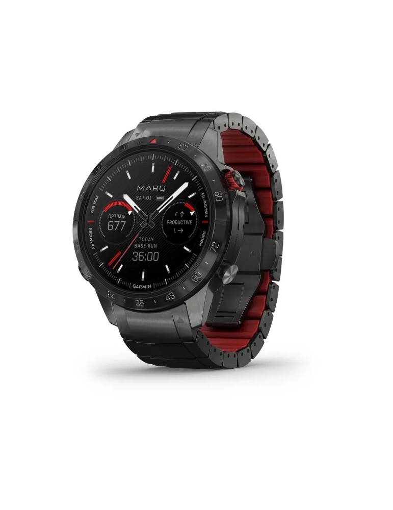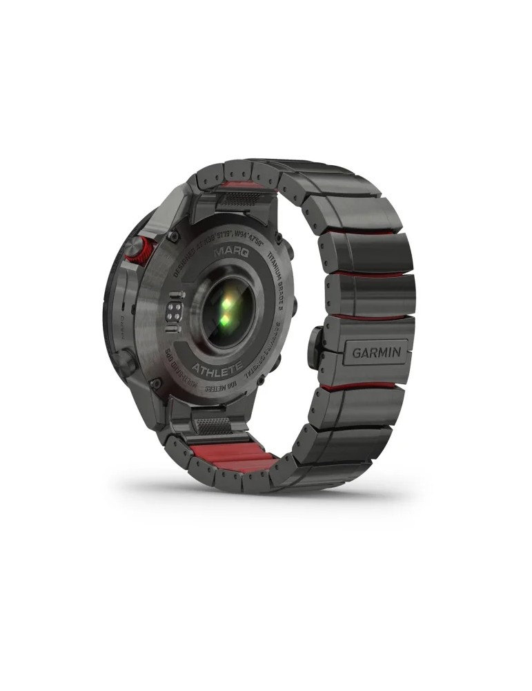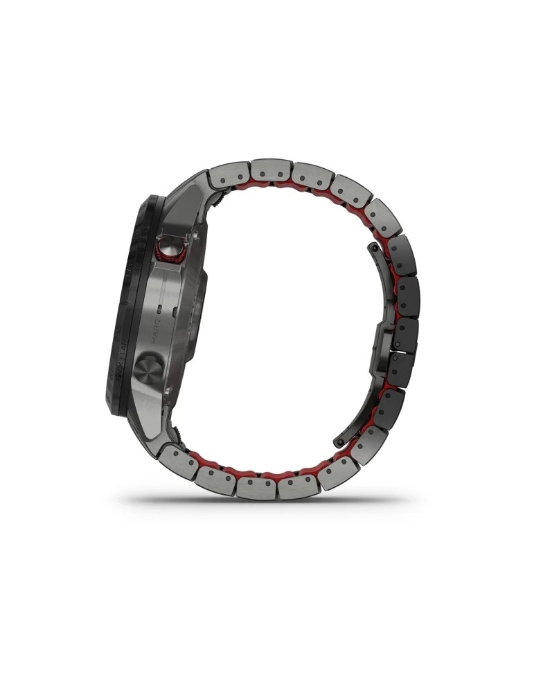 Сучасний годинник-інструмент MARQ® Athlete (Gen 2) - Performance Edition, створений для непохитних спортсменів, оснащений розкішним сенсорним AMOLED-дисплеєм з традиційними кнопками управління. Корпус діаметром 46 мм виготовлений з титану 5-го Класу, гібридний титановий браслет з червоними силіконовими ланками та застібкою-метеликом надає годиннику сучасного спортивного вигляду.
