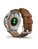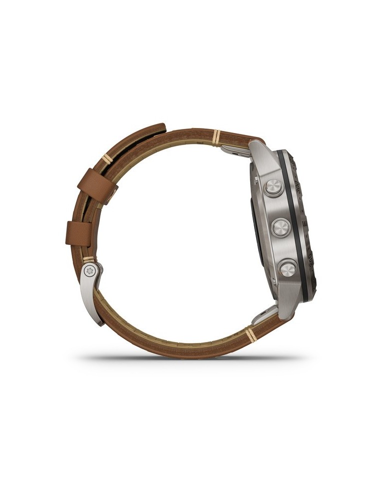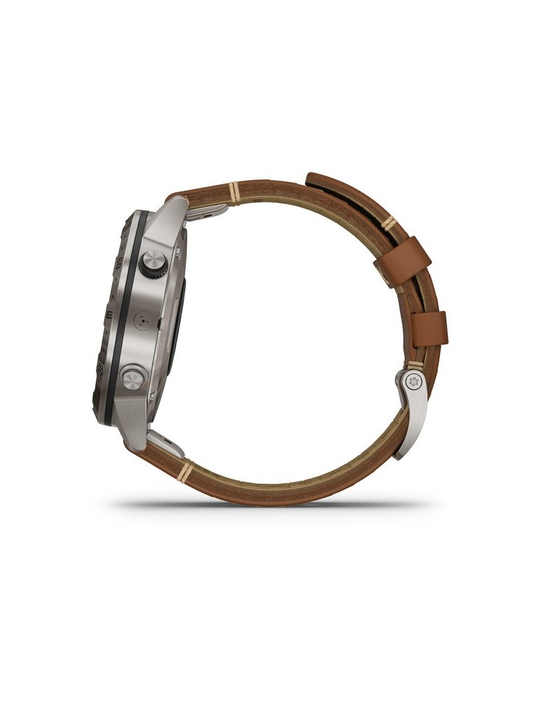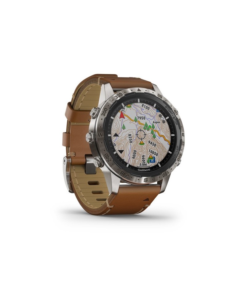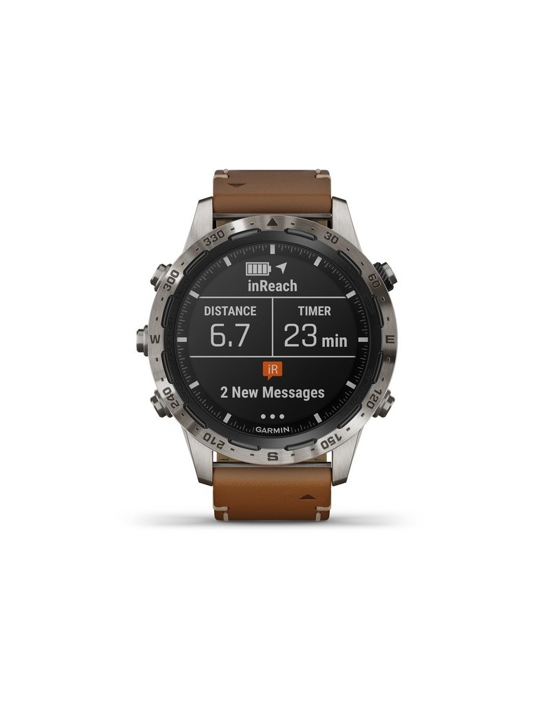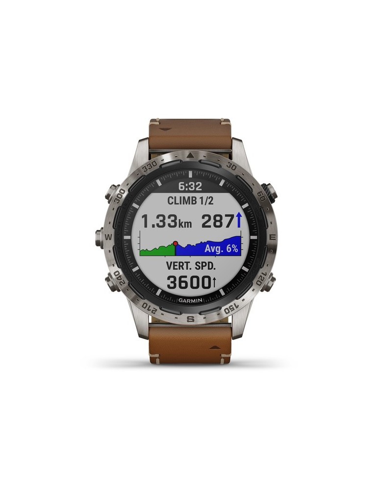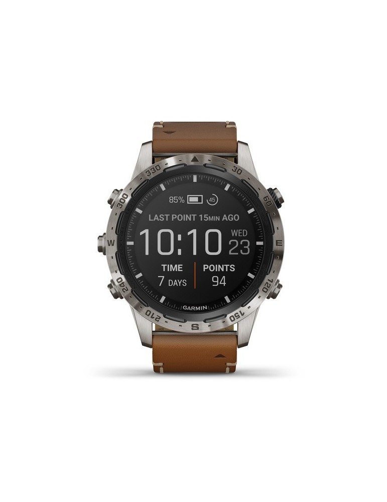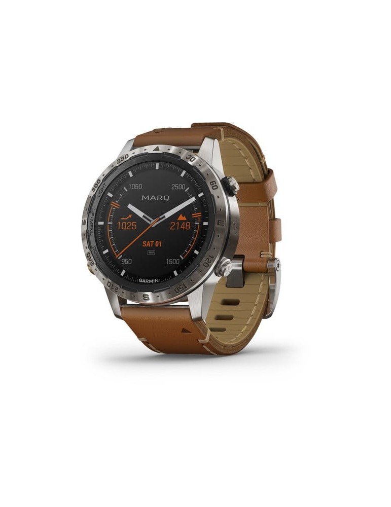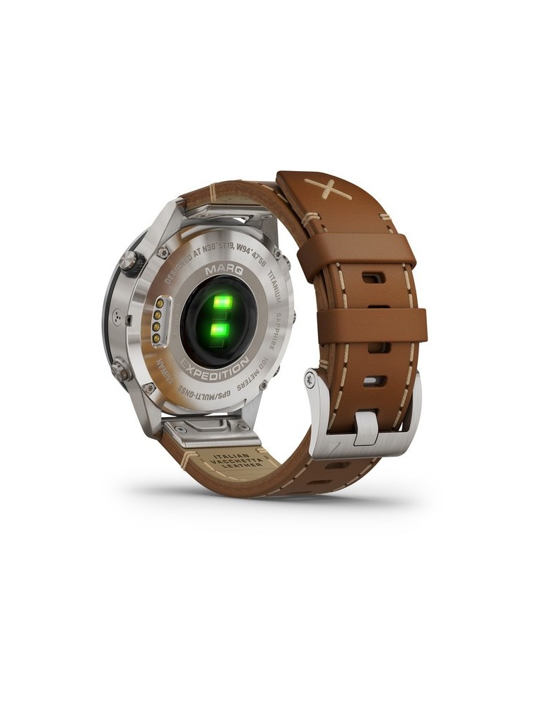 Стильний ремінець з італійської шкіри Vacchetta з фірмовим Х-подібним стібком забезпечує відмінне прилягання та тривале комфортне використання у будь-яких умовах. Годинники MARQ Expedition сумісні з програмою Garmin Explore, а також з бездротовим зовнішнім датчиком температури повітря (придбано окремо). Завдяки новому економічному режиму батарея пристрою може працювати до декількох тижнів, що особливо важливо в тривалих подорожах
