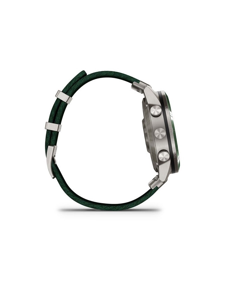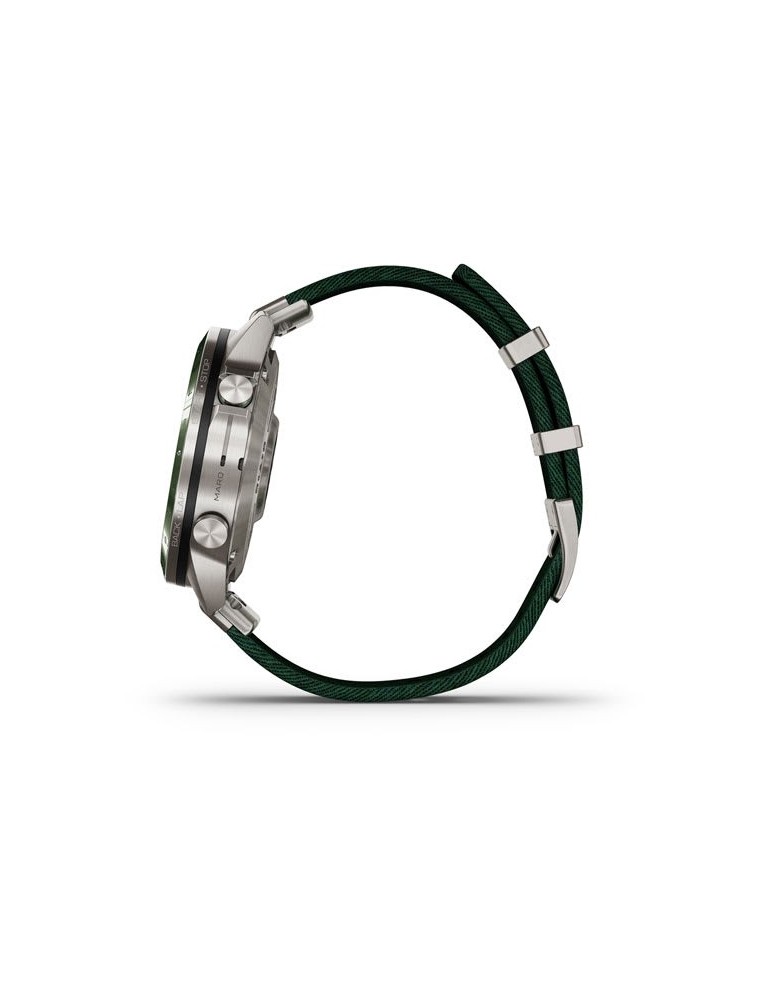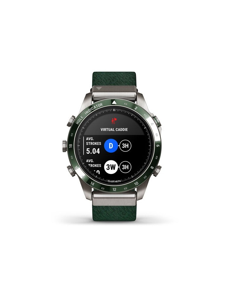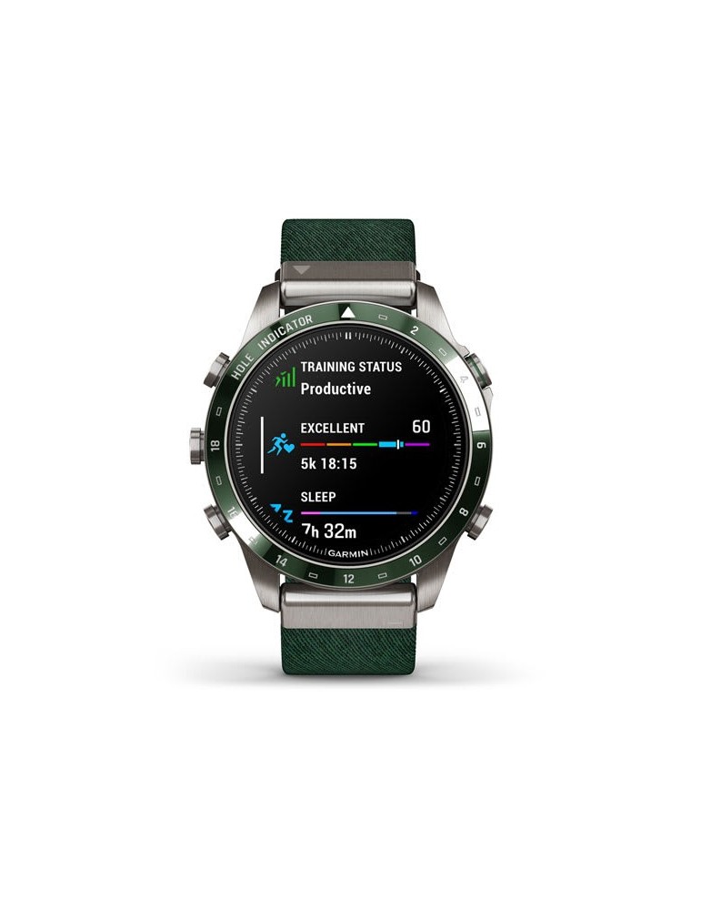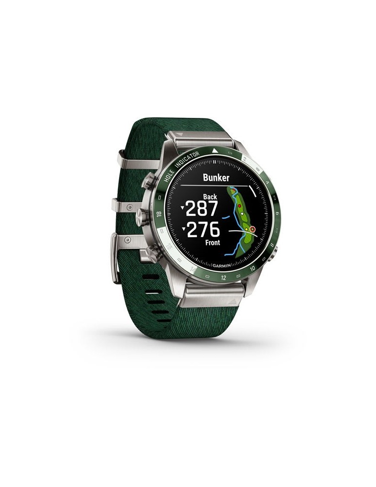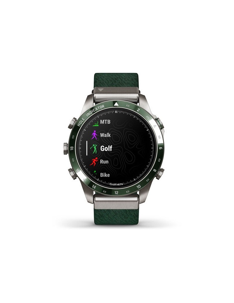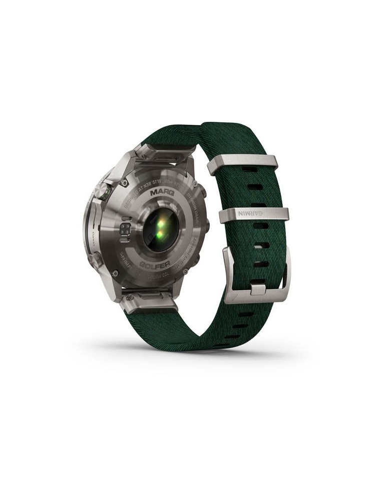 Нехай інші знають, що ви долаєте перешкоди, граючи. Розкішний сучасний годинник-інструмент MARQ® Golfer (Gen 2) з зеленим нейлоновим ремінцем жакардового плетіння Tritone Green оснащений приголомшливим сенсорним AMOLED-дисплеєм у поєднанні з традиційним кнопковим управлінням. Корпус 46 мм виготовлений з титану Класу 5 для ультрависокої міцності.