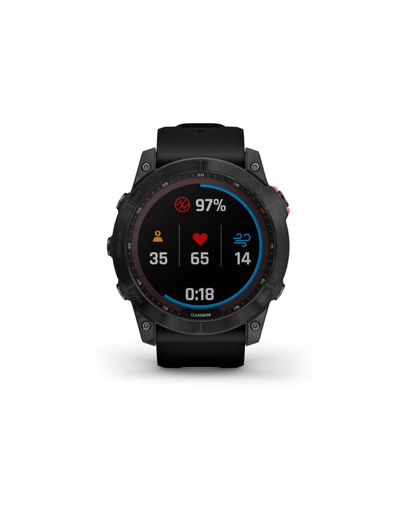 fēnix 7 має оновлений надміцний спортивний дизайн, великий 1,4-дюймовий екран із зарядом від сонячної батареї та корпус діаметром 51 мм. Пристрій перевірено відповідно до військових стандартів США на стійкість до температур, ударів та води.