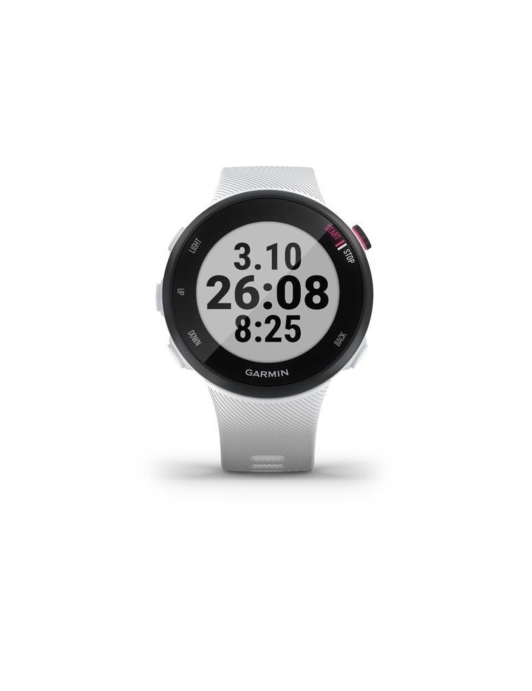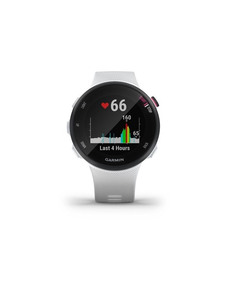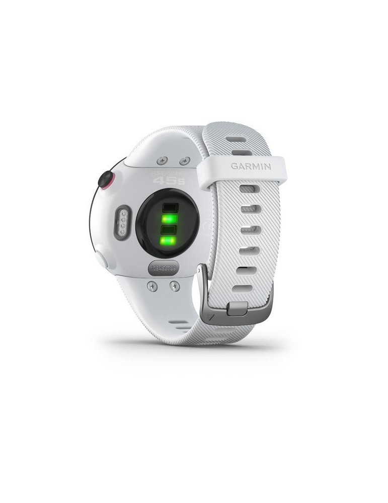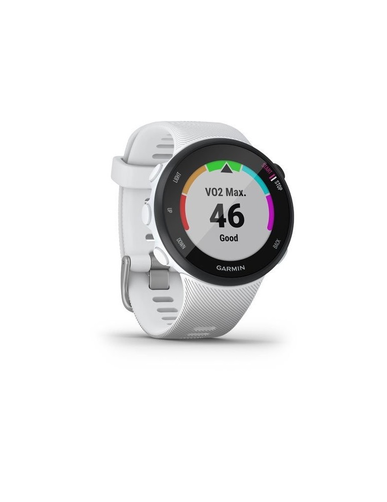 Цей простий у використанні біговий годинник ідеально підходить для щоденних пробіжок, тренувальних сесій і навіть для підготовки до забігу на 10 км, в якому вас умовили взяти участь. Вбудований GPS-приймач відстежує місце розташування і видає точні дані, включаючи відстань, темп і інтервали. Інтуїтивний кнопковий інтерфейс дозволяє швидко позначати початок нового кола або зупиняти таймер навіть якщо на руках є крапельки поту. Крім того, Forerunner 45 цілодобово вимірює частоту пульсу на зап'ясті1.