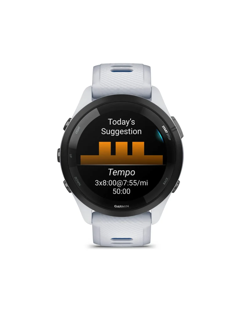 Що як ваша майбутня гонка стане неповторною? Що як персоналізовані щоденні тренування на зап'ясті допоможуть вам отримати максимальну віддачу від пробіжок? З розумним годинником Forerunner 265 усі дані про продуктивність та здоров'я можна легко прочитати на яскравому сенсорному AMOLED-дисплеї. Готуйтесь перевершувати себе.