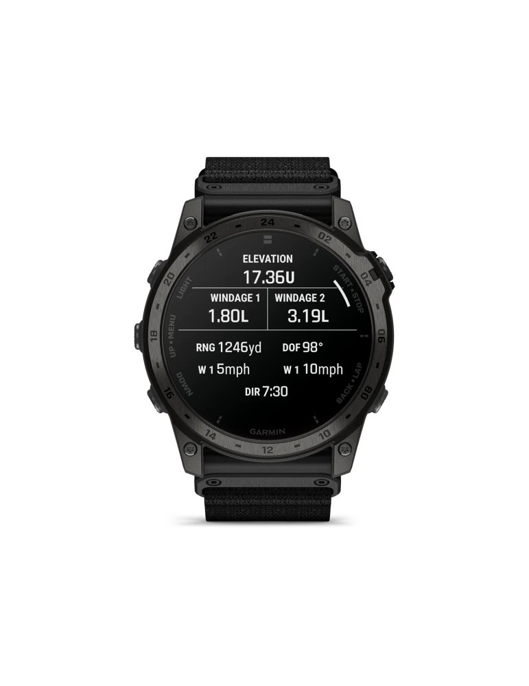 - Програмне забезпечення Applied Ballistics® попередньо завантажене на годинник і може бути розблоковане за допомогою мобільного додатку AB Synapse™ - Garmin (необхідна плата за розблокування).