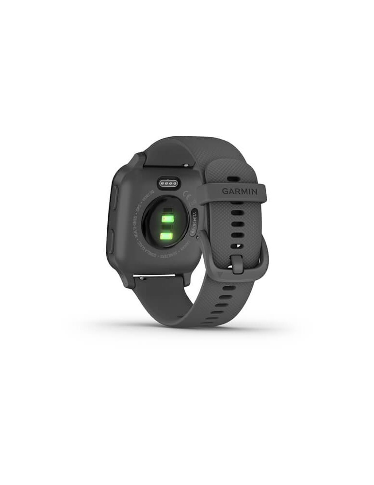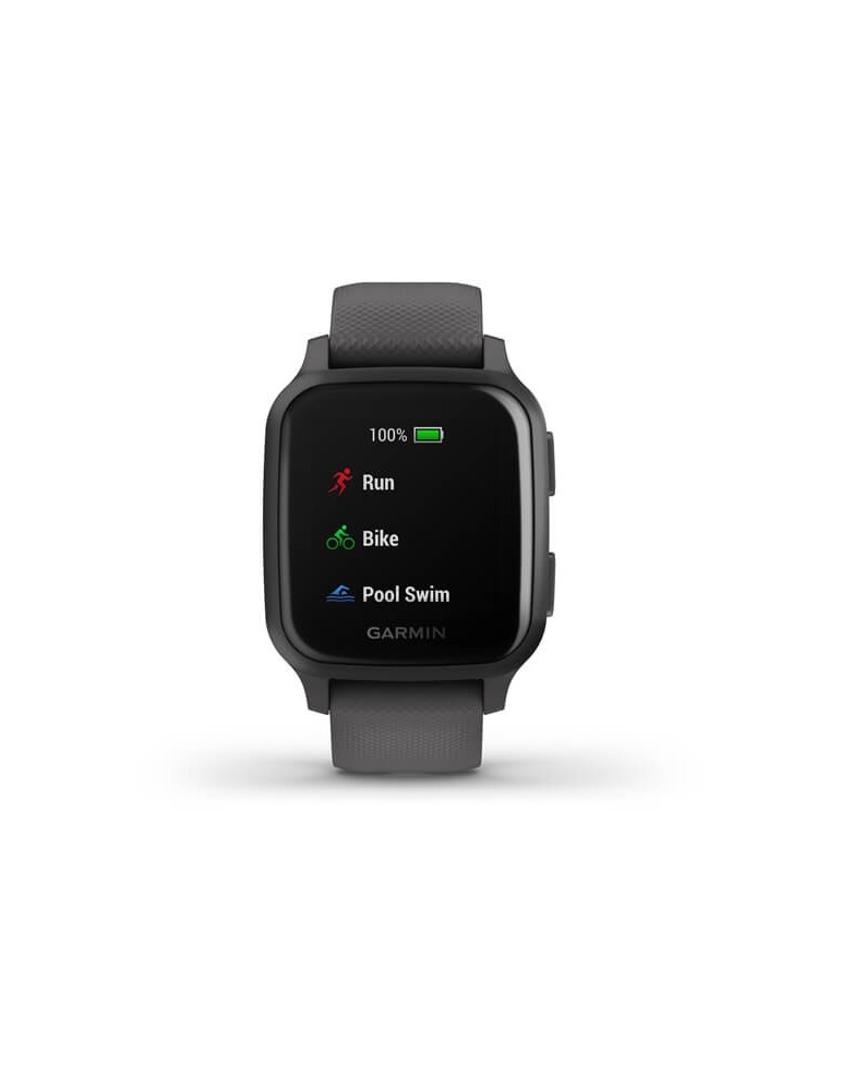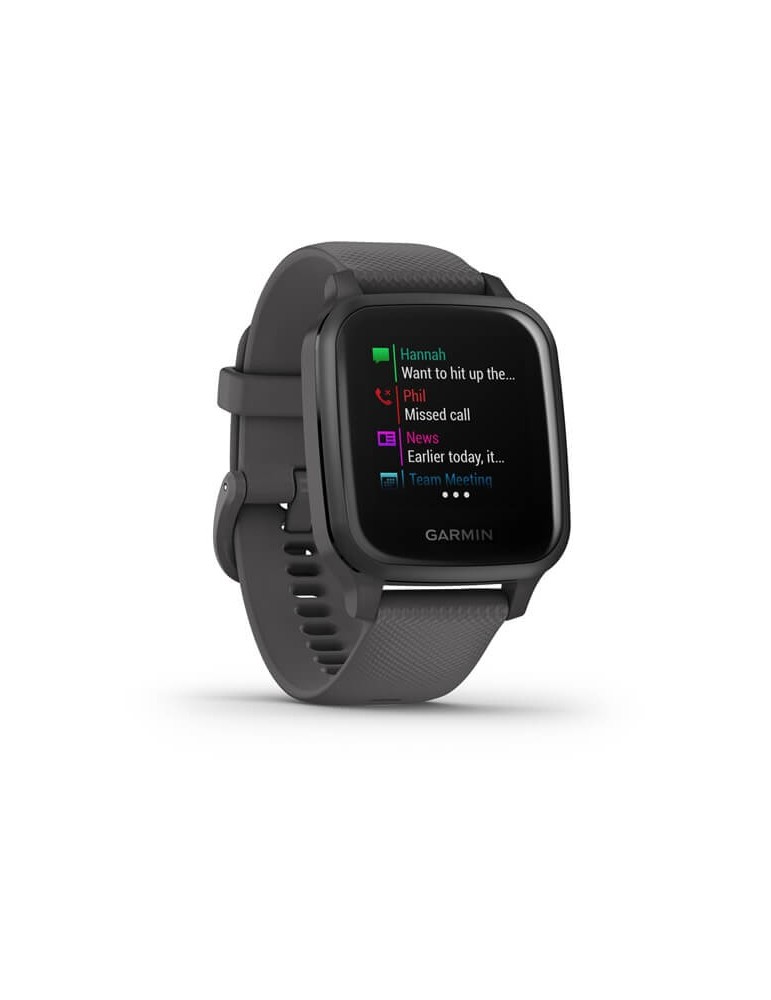 Екран Venu Sq вкритий міцним склом Corning® Gorilla® Glass 3, обрамляє його легкий та практичний алюмінієвий безель, стильний силіконовий ремінець комфортний у носінні. Цей годинник створений, щоб супроводжувати вас в усіх ваших справах.